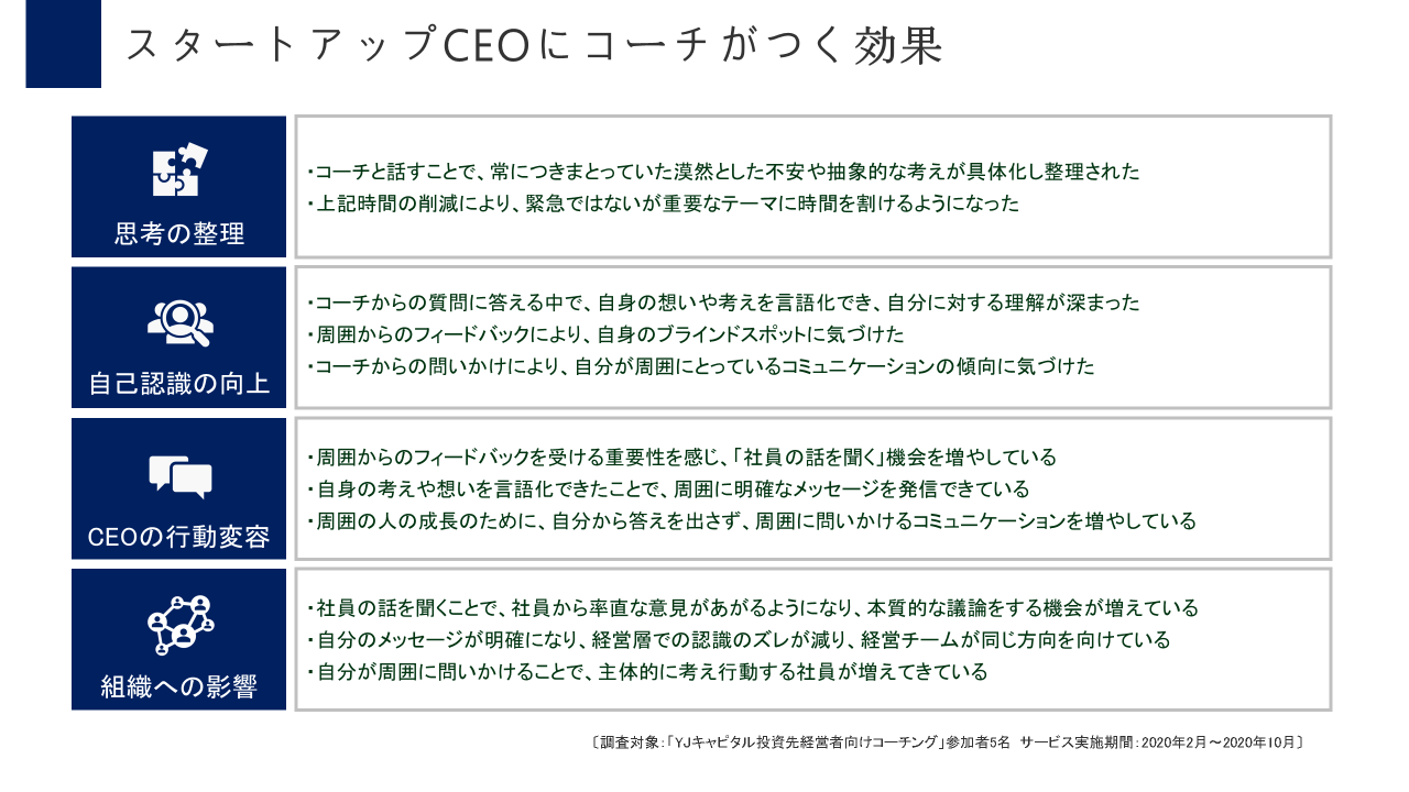 株式会社コーチ・エィ(東京都千代田区、代表取締役社長:鈴木義幸)は、YJキャピタル株式会社(東京都千代田区、代表取締役 堀新一郎)と共同で、スタートアップ企業の支援プログラムを実施して参りました。その一環で、YJキャピタルの投資先経営者にエグゼクティブ・コーチングを提供した成果についてご報告します。