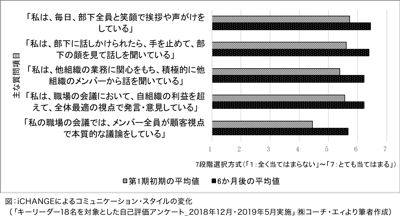 以下の図が示すのは、この取り組みでコーチをしたリーダーの、コミュニケーションに対する態度の変化です。リーダーはコーチングを行っていないときでも相手の話を良く聞くようになり、そのことによって自身の部下がアイディアを出すようになり、他の仕事に対しても積極的に参加するようになるという変化がみられました。