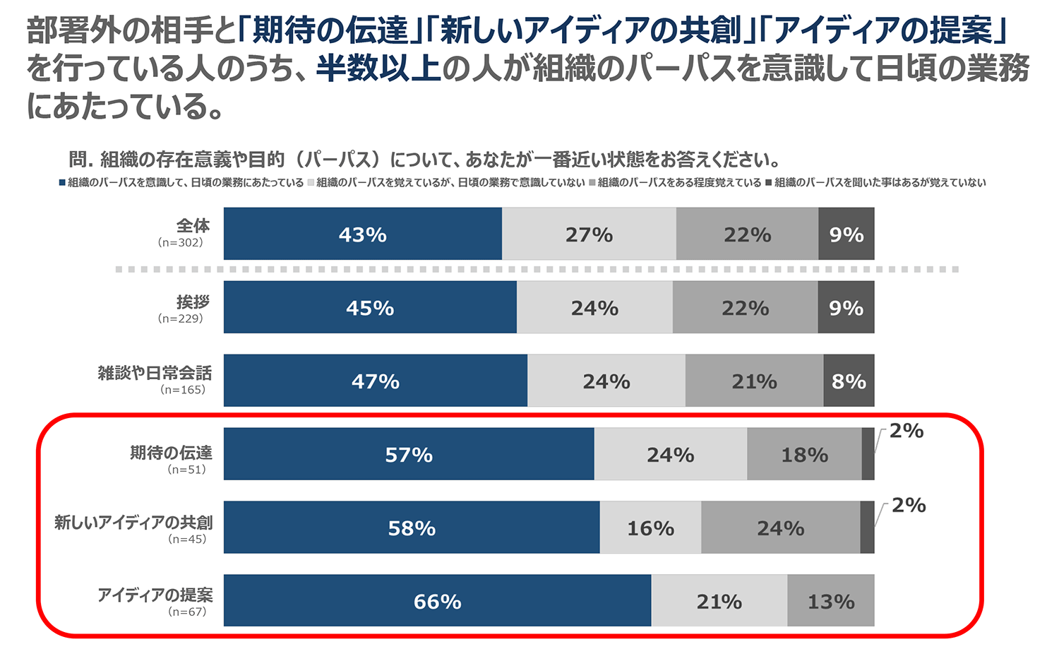 コミュニケーションの種類のうち、特に「期待の伝達」「新しいアイディアの共創」「アイディアの提案」といった共創的なコミュニケーションを行っている人たちはパーパスの体現度合いがより顕著であることがわかりました。以下は、部署外の人たちとの関わりにおいて、特に「挨拶」「雑談や日常会話」といった日常のコミュニケーションと、共創的なコミュニケーションを取り上げて比較したグラフです。実際には、部署内外にかかわらず、周囲と共創的なコミュニケーションを行っている人の半数以上が、日頃からパーパスを意識して業務にあたっていると回答しました。