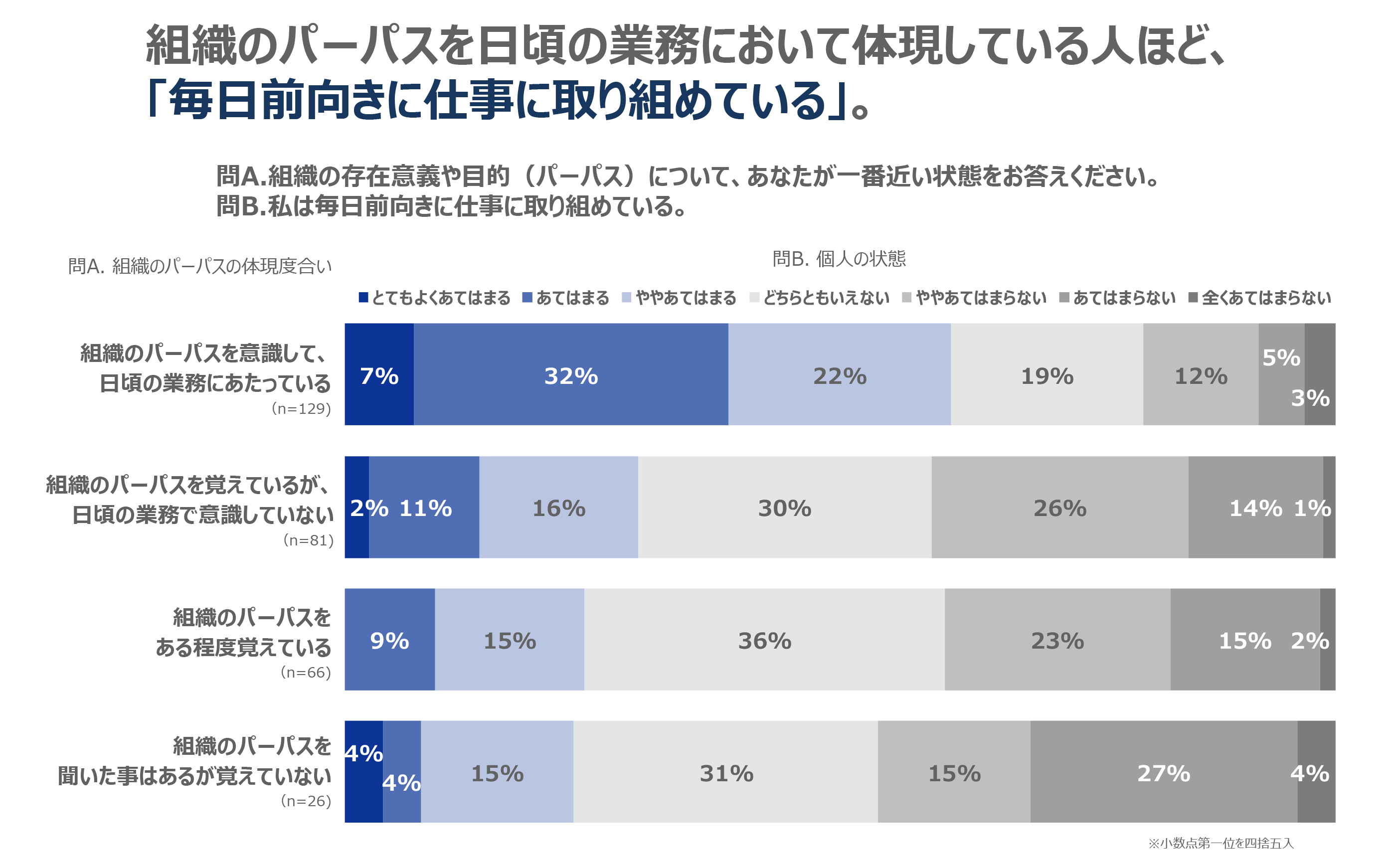 また本調査では、パーパスを体現している度合いと、仕事に対する取り組み姿勢についても調査しました。その結果、パーパスを意識して日頃の業務に当たっている人の61%(ややあてはまる~とてもよくあてはまるの割合)が、毎日前向きに仕事に取り組めていると回答しました。「組織のパーパスを聞いたことはあるが覚えていない」人の場合は、この数字が23%にとどまり、パーパスを意識している人の1/3近くにまで落ち込みます。