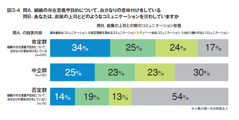 - 「直属の上司は仕事における私(部下)の目標を明確にしようとしているか」の質問に対して、共創的なコミュニケーションを取る層の約7割が肯定的だったのに対して、当たり障りのないコミュニケーションをする層は2割以下