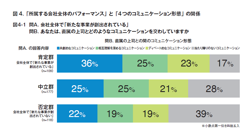 また、図4-1のように、この「コミュニケーション形態とパフォーマンスの肯定度合い」の関係性は、部下自身だけでなく所属する組織全体のパフォーマンスに関する設問でも同様であることが分りました。