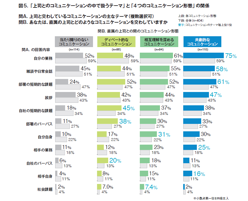以下の図5は、4つのコミュニケーション形態ごとに、「上司とのコミュニケーションのなかで扱うテーマ」の割合を調べたものです。