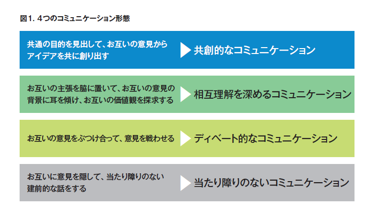 - ※ 「対話」は、「向かい合って話すこと。相対して話すこと。二人の人が言葉をかわすこと。」(広辞苑第7版)と定義されていますが、人が言葉をかわして他者と関わるコミュニケーションには実に多様な形態が存在します。今回の調査では、形態を4つにグルーピングし、そのうち「共創的なコミュニケーション」を「対話」と定義しています。