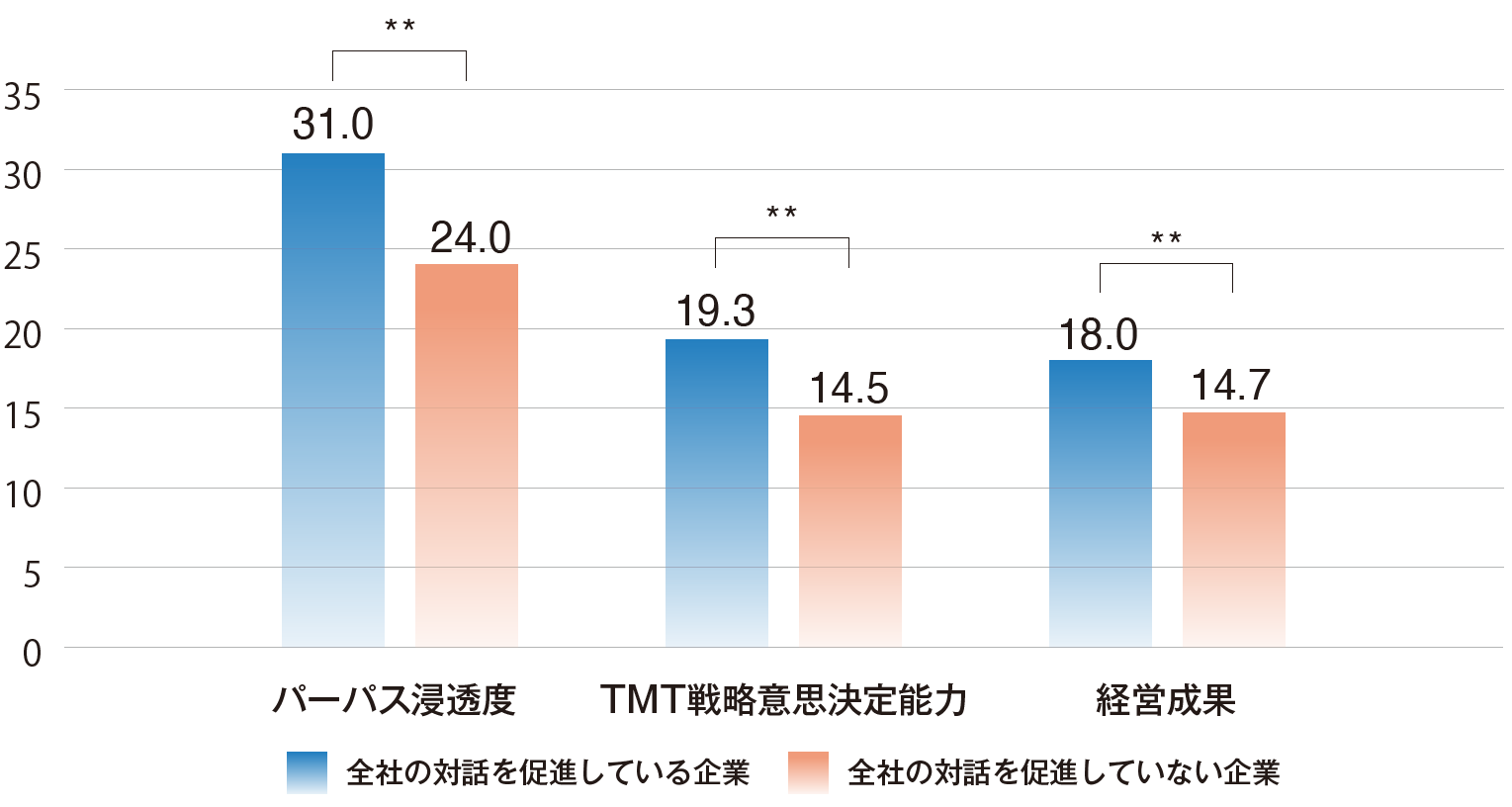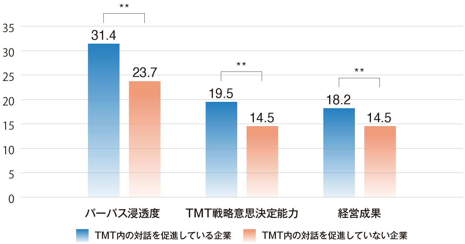 分析の結果、【対話を促進している企業】では、経営チームと会社全体ともに、パーパス浸透度、経営チームの戦略的意思決定能力、経営成果が【対話を促進していない企業】よりも統計的に有意に高いことが示されました。