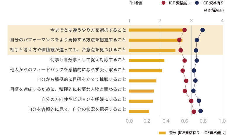 熟練度の高いコーチは総じてクライアントの評価が高く、特に違いの出る3つの効果がある