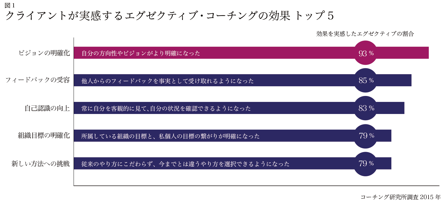 調査の結果、「効果がある」と回答したクライアントの割合が多かった上位5項目は、図1の通りでした。1位は「ビジョンの明確化」であり、93%のクライアントがその効果を実感しています。