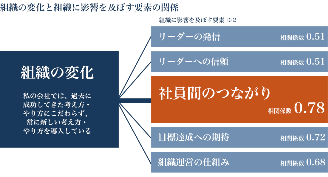 分析の結果、「組織の変化」項目と最も相関が強い要素は「社員間のつながり 0.78(相関係数、以下同)」でした。次に「目標への期待 0.72」「組織運営の仕組み 0.68」と続きます。
