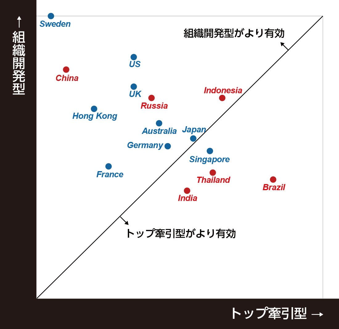 2つの類型の傾向の強さを、リーダーに対する評価データを使って国別に算出し、プロットしたものが図1です。中央に引いた線より左上に位置する国は「組織開発型」のリーダーシップ、右下に位置する国は「トップ牽引型」のリーダーシップがより効果的、ということになります。