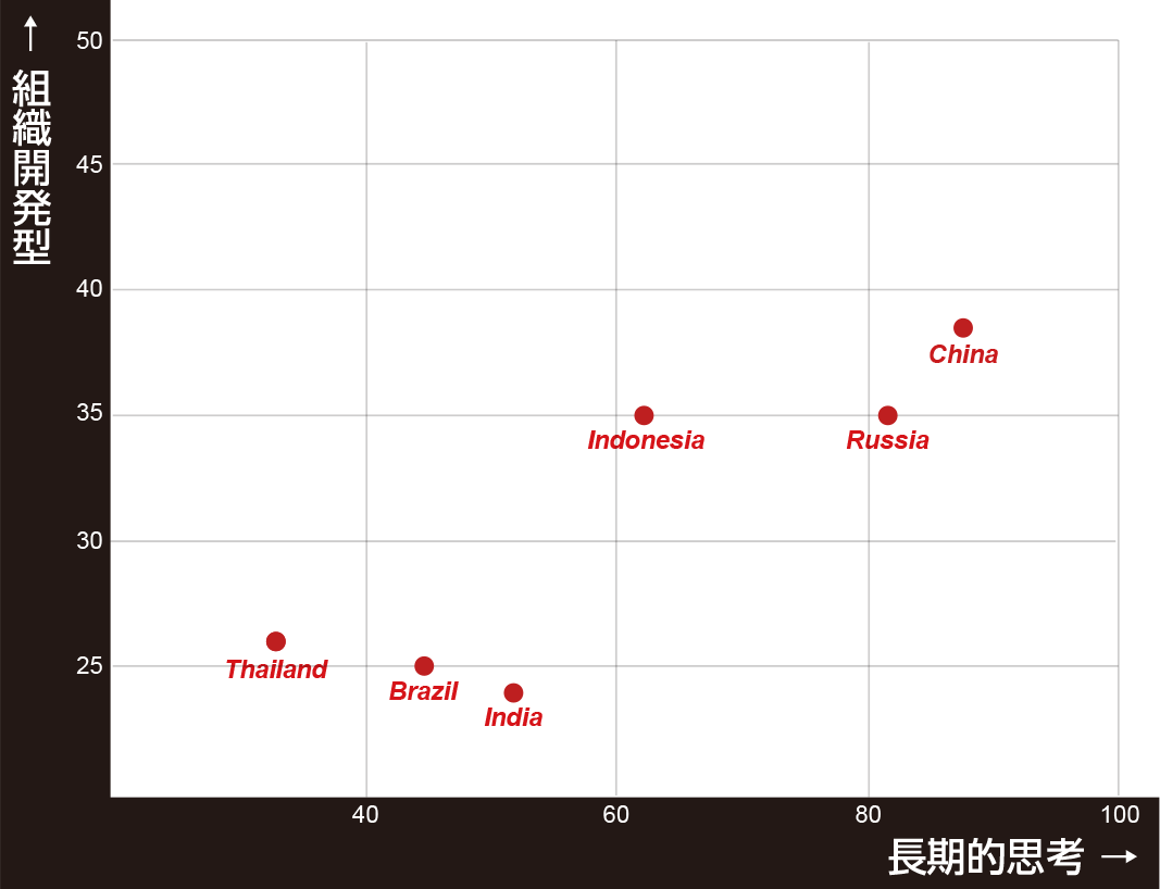 さまざまな国の価値観を調べ、指標化したものに「Hofstede指数」(※3)がありますが、そのひとつに「長期的志向」(Long-term orientation vs. short term orientation)があります。伝統的な規範にとらわれない未来的な志向の強い価値観です。この「長期的志向」と「組織開発型」リーダーシップの有効度との相関を、新興国6ヵ国で見たのが図2です。