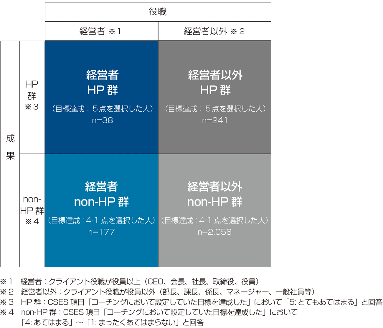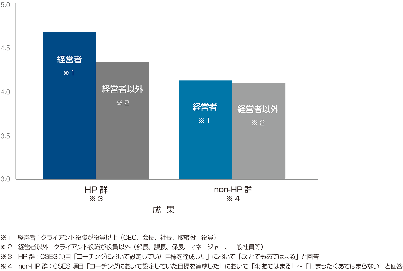 さらに、役職(経営者と経営者以外)と成果(HP群とnon-HP群)で4グループに区分し、「コーチの関わり方」の違いを分析しました。(図.2)