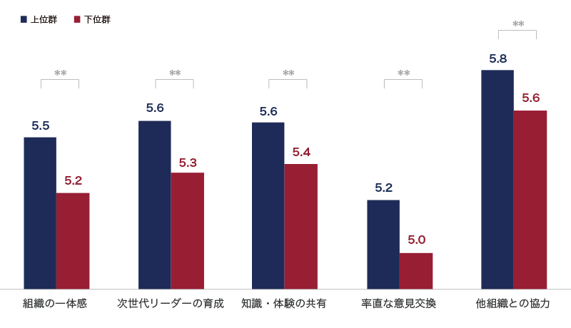 まず、全リーダーシップ要素のうち「Learning Agility」を除いた49項目のスコアが、平均値を上回っている742人を抽出しました。その中で「Learning Agility」のスコアが高いリーダーの組織(上位群)と低いリーダーの組織(下位群)の2つに分けました。それぞれの群のリーダーが管轄する"組織の状態"の違いをみたのが図1です。