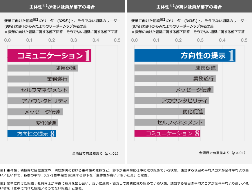 一方で、「部下の主体性が高いケース」ではどうでしょうか。部下の主体性は高いものの、組織としては、そのシナジー効果が発揮されず、変革をもたらす職場になりきれていないケースです。そういう場面では、リーダーはまず、組織のビジョンや目標といった組織の方向性を伝え、それについて部下と対話をしていくことが有効的です(右図の結果より)。あなたの語る組織のビジョンや目標が、あなたと部下たちにとっての未来像として共有できると、部下同士の率直な意見交換や対話の中身や、部門間での連携・協力などが、未来を見据えたものに変わり、組織としての変革が加速されることにつながるでしょう。