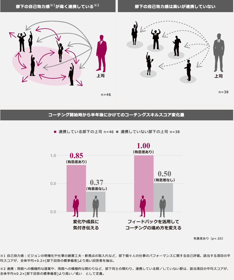 ※2 連携:周囲への積極的な提案や、周囲への積極的な関わりなど、部下同士の関わり。連携している群/していない群は、該当項目の平均スコアが、全体平均±0.2×[部下回答の標準偏差]より高い/低い として定義。